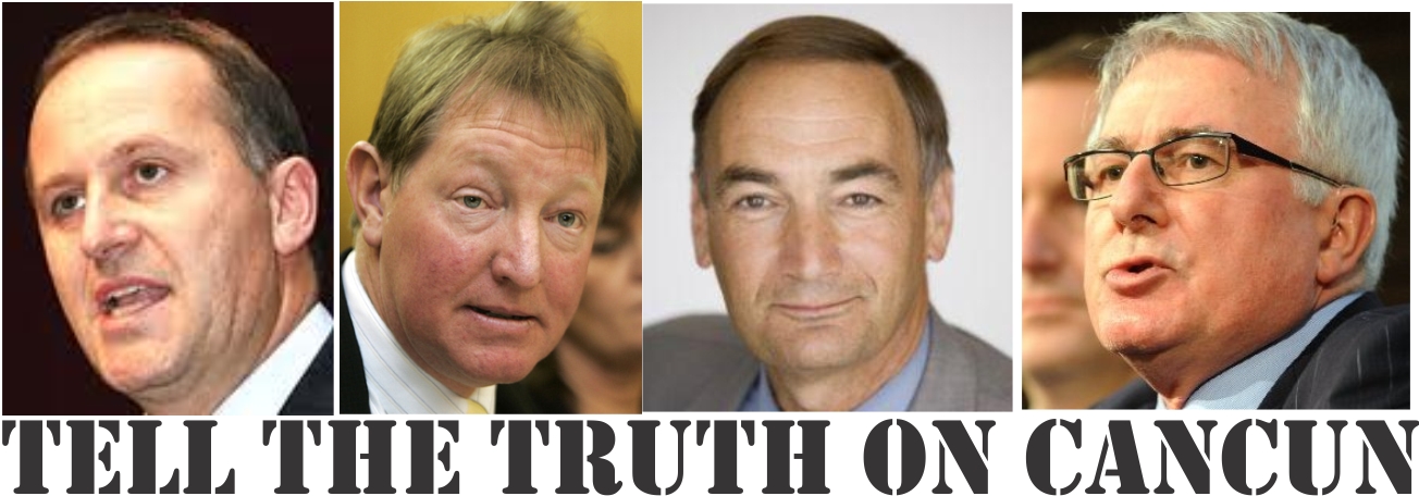 If every NZer knew what was really happening in Cancun, what the snivelling Smith and his cronies had signed us up to, Key and his gang of weak kneed lily livered do nothing losers would be out on their ear in a millisecond. That Key allows Smith and Groser to involve NZ in this charade is another pointer to what an utterly ineffectual leader we have. National, Key, Smith, Groser, what a useless pack of clowns, sending this country down the tube for the sake of a pat on the back from a collection of thugs and dictators. Unforgivable. Utterly unforgivable.