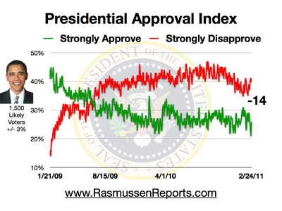 President Obama’s job approval ratings have taken a dive this week in the Rasmussen Reports daily Presidential Tracking Poll, and the number of voters who give him favorable ratings for leadership has fallen to its lowest level since he took office in January 2009.