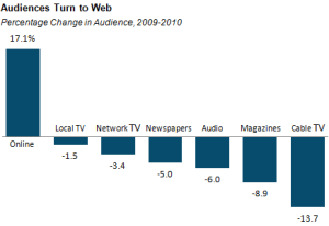 A new Nielsen Media Research Pew Research Center poll in the US shows that 41% of people now get their news from the internet, up 17% from last year. Audiences for almost every network news program fell again in 2010. Evening news audiences fell by 752,000 viewers, or 3.4%, from 2009 and have been on a downward trend for three decades.