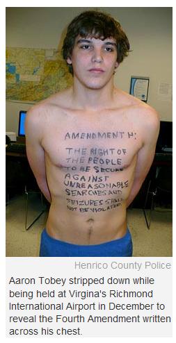 A while ago I did a post on Aaron Tobey who was arrested during an airport security scan for stripping to his underwear and displaying the 4th amendment to the Constitution written on his torso. He was charged with Disorderly Conduct and nandcuffed and interrogated for 90 minutes before being released and permitted to catch his flight to his grandfather’s funeral.