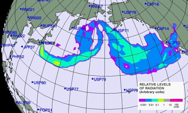 “The forecast does not show actual levels of radiation, but it does allow the organization to estimate when different monitoring stations, marked with small dots, might be able to detect extremely low levels of radiation.”
