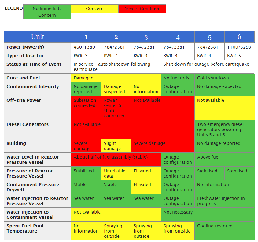 Damage Control, Fukushima Daiichi Summary Table – Units 1-6