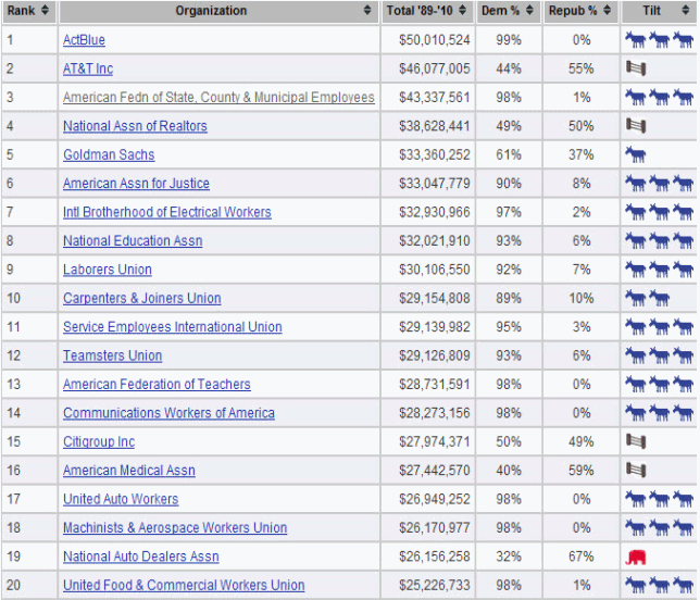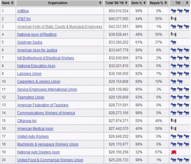 Over the last eleven years or so the Koch Bros have made about $10.8 million worth of personal political donations. Ten percent of that going to the Democrats. The left wing unions have donated $562 million, almost all to the Democrats. The full extent of the real donations situation is exposed in the two illustrations below. In the list of top 100 donors, the top 20 are, apart from one, all Democrat donors. (minus a few fence sitters) The Kochs come in at No.84.