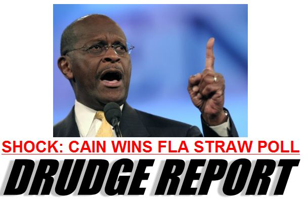 Drudge reports that businessman Herman Cain scored a major upset Saturday, winning the Florida straw poll and creating a new set of problems for Texas Gov. Rick Perry.