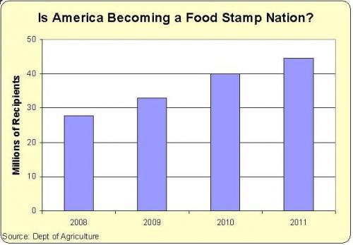 Another is the left’s redistribution policies, which produce poverty traps and provide a clear disincentive for welfare recipients to get off their backside and work and improve their situation. (See chart fig 1) If you’re going to give more and more people food stamps, (chart fig 2) or other forms of welfare, of course their not going to get rich.
